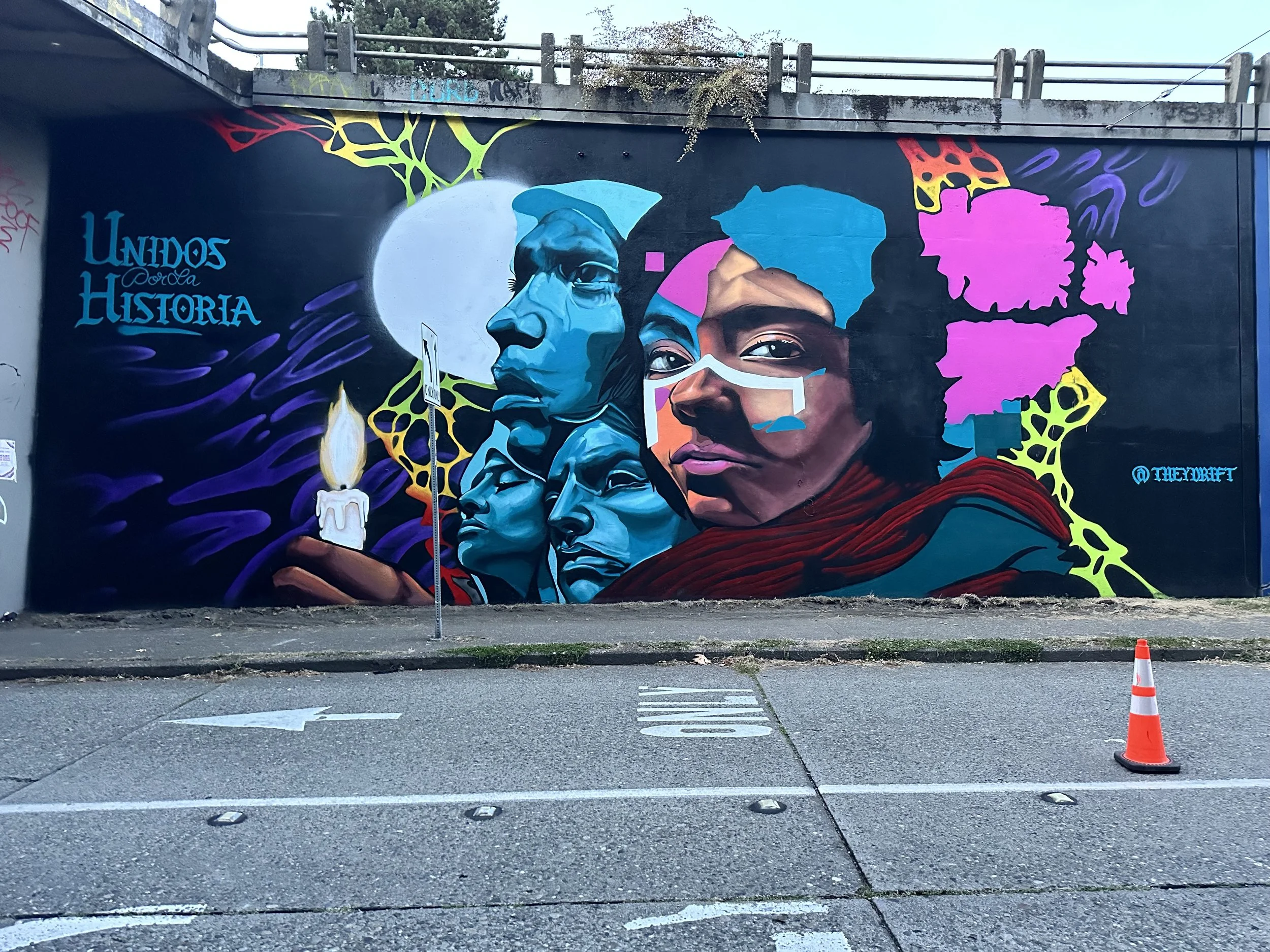UNIDOS por la Historia - United by History Most recent mural in collaboration with MEXAM, The Mexican consulate in Seattle and The City of Seattle 20x40 ft located on Campus parkway in Seattle WA -2025